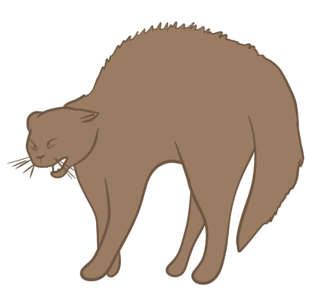 • chat agressif : position dressé, oreilles aplatis en arrière, queue droite et hérissée, pupilles dilatées ou rétrécies en extrême, peut montrer les griffes ou les dents, feulements, grognements et cris il peut également cracher.