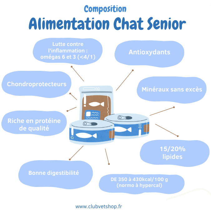 L'alimentation pour chat senior doit être enrichie en ingrédients pour favoriser la digestion qui est moins performante avec l'âge et doit contenir des protéines de haute qualité pour éviter de léser les reins.