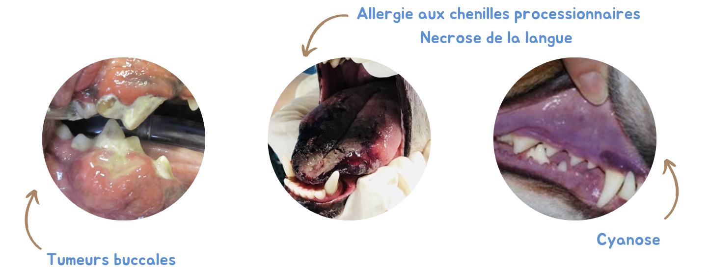 - cyanose : l'assombrissement des muqueuses (langue, gencives) est dû à une faible oxygénation du sang, la cyanose est liée à une condition primaire telle qu'une insuffisance cardiaque, une affection respiratoire ou une obstruction des conduits respiratoires, elle est une urgence médicale,