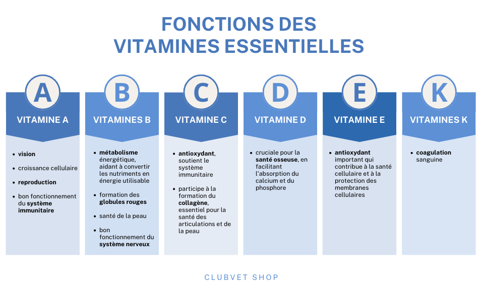 Les vitamines ainsi que les autres nutriments essentiels (protéines, lipides, glucides et minéraux) jouent un rôle majeur dans leur santé globale, soutenant diverses fonctions physiologiques.