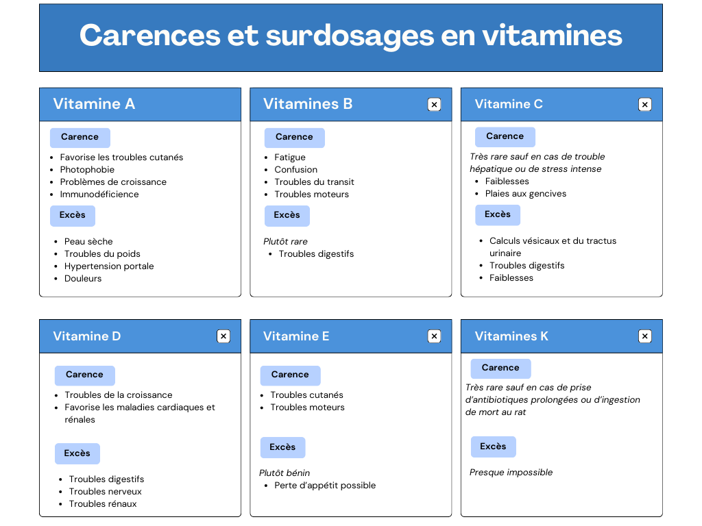 Chaque vitamine à un ou plusieurs rôles et participent à des fonctions vitales.