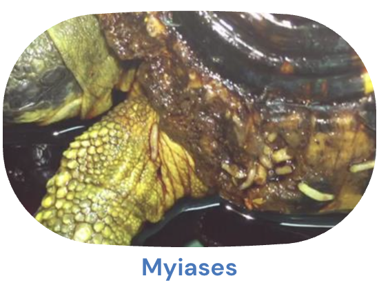 Les tortues sont sujettes aux myiases (larves de mouches) surtout lorsqu'elles vivent en extérieur.