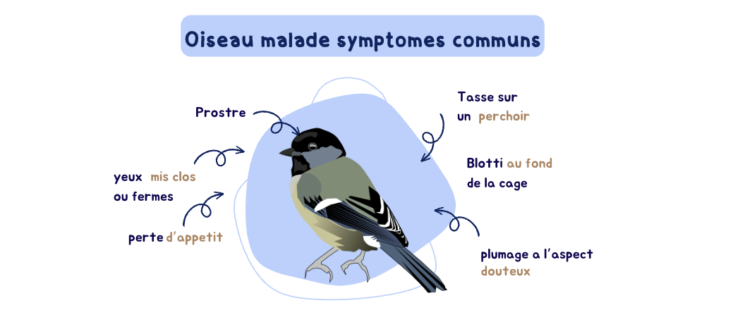 - Provoque : perte d'énergie soudaine, plumes ébouriffées, somnolence (yeux mis clos), troubles digestifs et détresse respiratoire (bec ouvert).