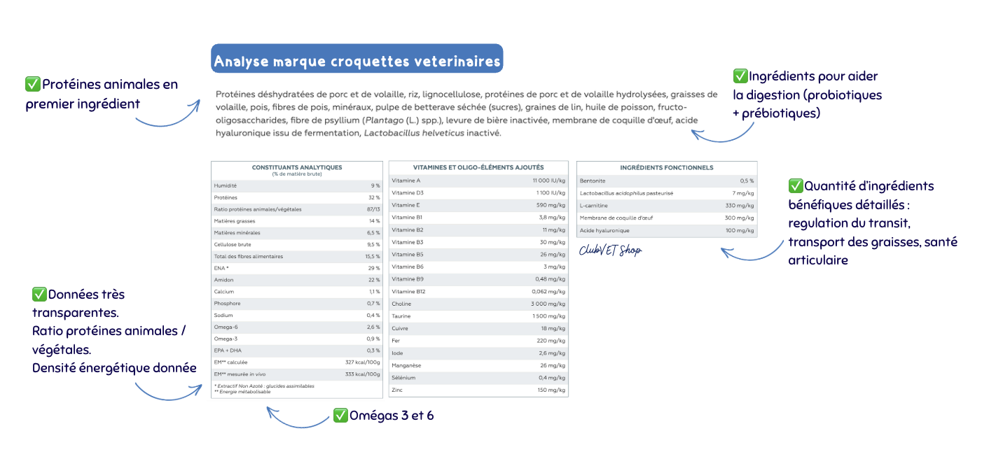 Les gammes premium et vétérinaires vont plus loin en intégrant souvent des ingrédients à visée préventive (probiotiques, antioxydants, protecteurs articulaires, etc.), qui soutiennent durablement la santé de votre compagnon.