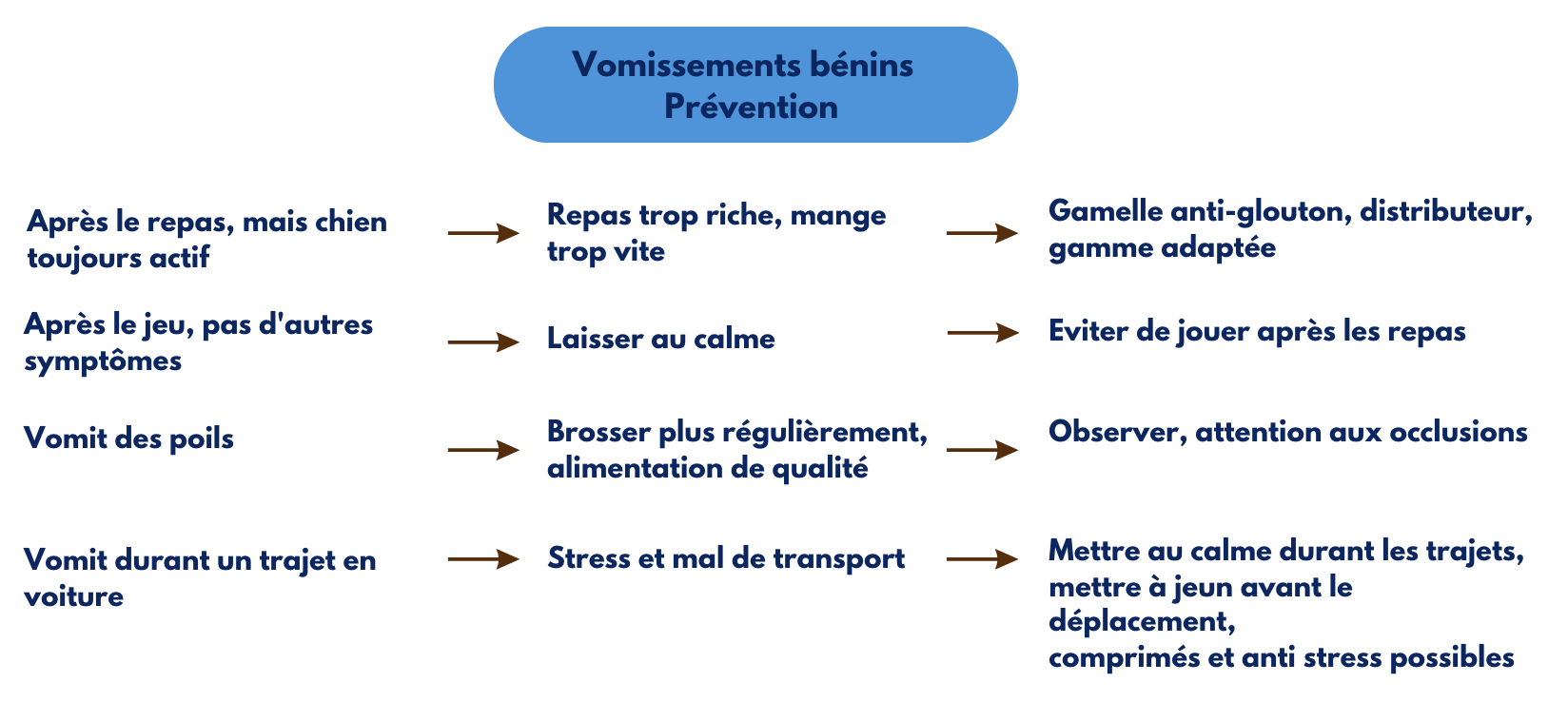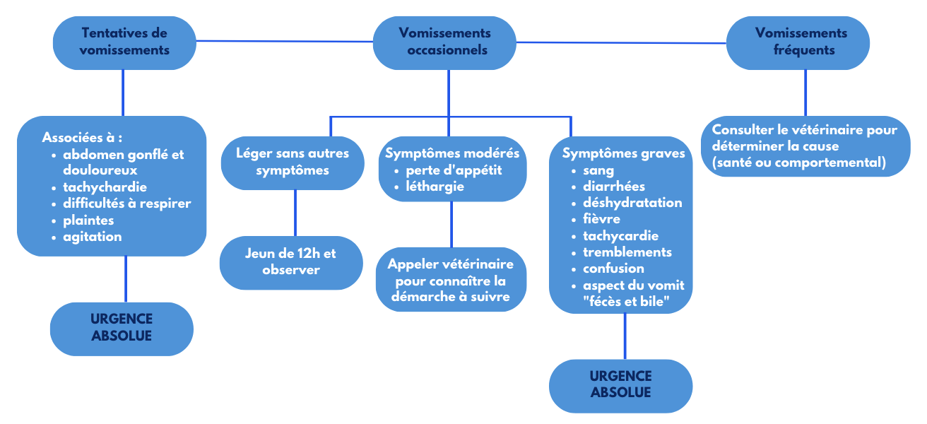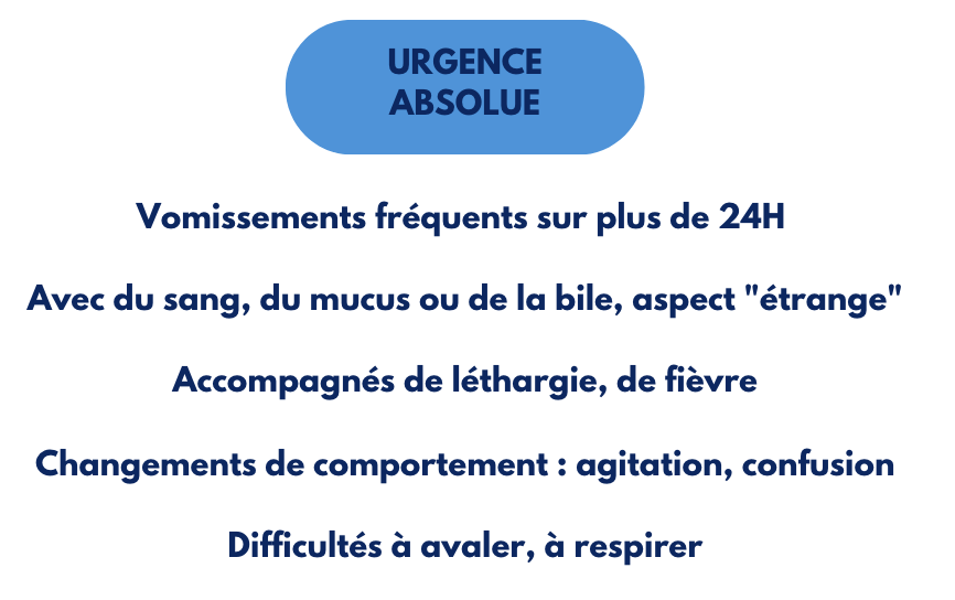 Vomissement très fréquent et/ou atteinte de l'état général et/ou perte d'appétit et/ou présence de sang et/ou très jeune animal = consulter rapidement